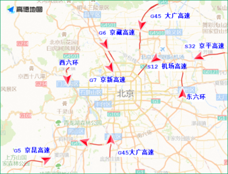 京藏高速八达岭至居庸关、西关出口,京承高速望和桥至酸枣岭桥,京港澳高速杜家坎、长阳路段,京开高速榆垡、玉泉营等路段通行压力较大;望和桥、健翔桥、来广营桥、箭亭桥等环路和高速公路相交的桥区节点也易出现车流量大引发通行不畅。